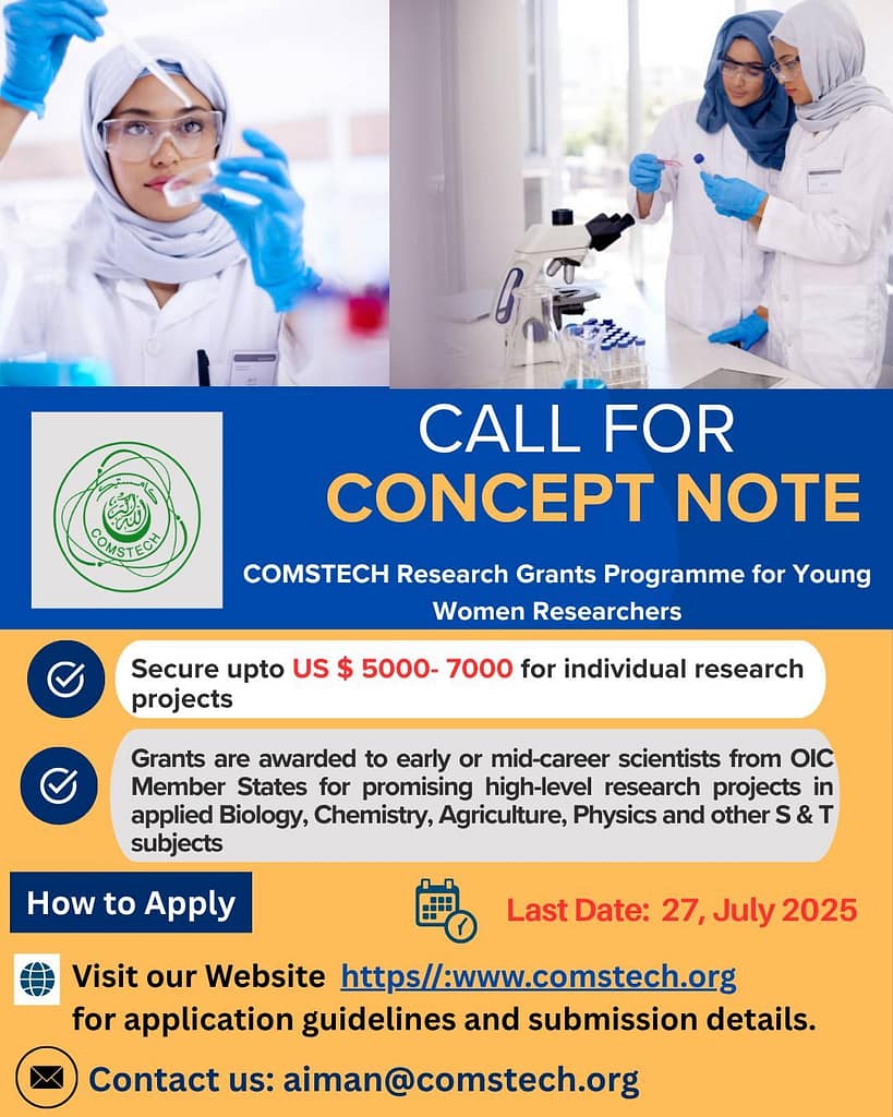 Are you a young woman scientist from an OIC Member State looking to advance your research career? The COMSTECH Research Grants Programme 2025 offers an exciting opportunity for early and mid-career women researchers to secure USD 5,000–7,000 in funding for individual research projects. This fully funded research grant supports high-potential women researchers across applied sciences and aims to strengthen scientific capacity, curb brain drain, and boost innovation in OIC countries.