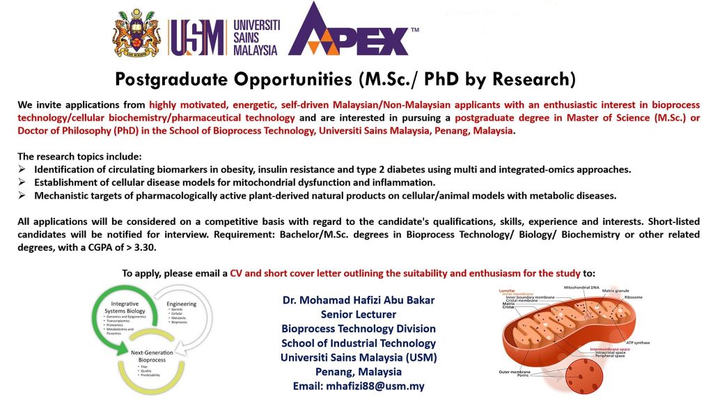 We invite application from highly motivated, energetic and a self-driven Malaysian and international applicants with an enthusiastic interest in Bioprocess Technology (Pharmaceutical/ Biochemistry/ DNA-Metabolites Technology) to pursue a postgraduate study in PhD/MSc at the Bioprocess Technology Division, School of Industrial Technology, Universiti Sains Malaysia, Penang, Malaysia.