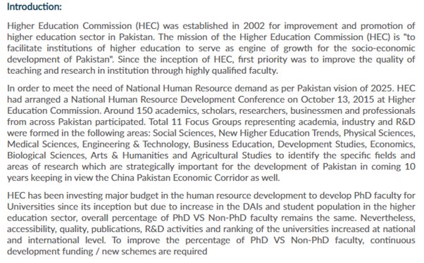 In order to develop and promote the higher education sector in Pakistan, the Higher Education Commission (HEC) was established in 2002. The Higher Education Commission ( HEC)’s mission is “to promote higher education institutions that serve as the engine of growth for Pakistan’s socio-economic development.” The first goal since HEC ‘s establishment has been to enhance the standard of institutional teaching and study by highly qualified faculty.