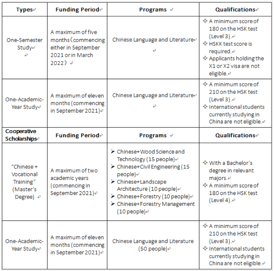 Zhejiang A & F University has a wide range of degree programs for international students to pursue language courses and master’s degrees with fully-funded Chinese scholarships in china 2021. International Chinese Language Teachers Scholarship 2021 is offered for international applicants to study Chinese language and vocational training programs at ZAFU China. A list of provided programs for this scholarship is given in the above picture.