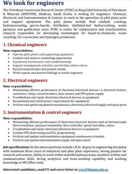 Are you an experienced engineer ready to dive into cutting-edge research and technology? The Petroleum Conversion Research Center (PCRC) at King Fahd University of Petroleum & Minerals (KFUPM) is seeking exceptional professionals to join our innovative team in Dhahran, Saudi Arabia. KFUPM is currently hiring Chemical Engineers, Electrical Engineers, and Instrumentation & Control Engineers to support our state-of-the-art pilot plant operations and research initiatives.