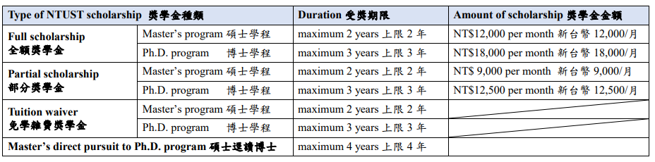 International graduate students aspiring to enroll in NTUST’s English-taught master’s and doctoral programs on a full-time basis have the opportunity to apply for a one-year scholarship. The continuation of this scholarship is contingent upon the student’s demonstrated academic and research performance. The department will choose the specific NTUST scholarship category after taking the applicant’s qualifications into account.