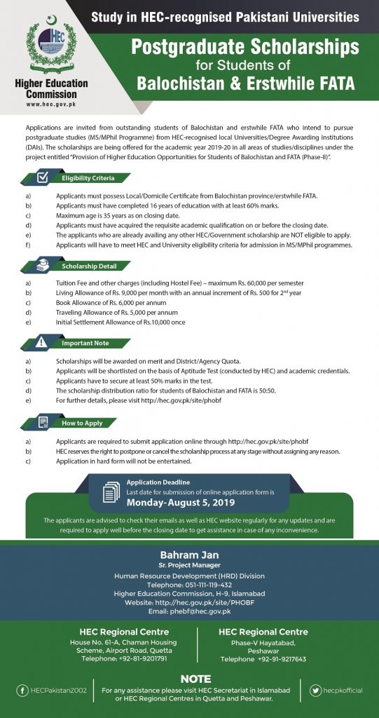 Applications are invited from outstanding students from Balochistan and erstwhile FATA who intend to pursue postgraduate studies (MS/M.Phil Program) from HEC recognized local Universities/Degree Awarding Institutions (DAIs). The Scholarships are being offered for the academic year 2019-20 in all areas of studies/disciplines under the project entitled “Provision of Higher Education Opportunities for the Students of Balochistan and FATA (Phase-II)”.
