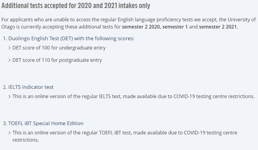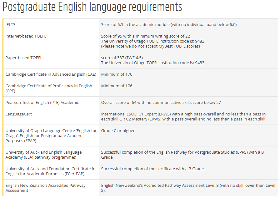 Otago University accepts several International tests and results, and students from some countries may be able to use their previous studies to demonstrate their language level. Check the language results we accept and if applicants meet the minimum requirements in the table below.