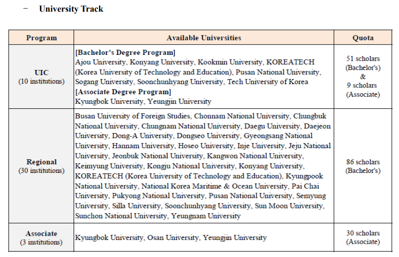 There are two distinct tracks for applying to these fully funded undergraduate degree scholarships in Korea: the Embassy Track and the University Track. As an aspiring student, you have the exciting option to apply under both tracks for these coveted scholarships. In total, 220 fully funded scholarships are available for international students to pursue undergraduate degree programs in various disciplines, including Engineering, Natural Sciences, Social Sciences, and more.