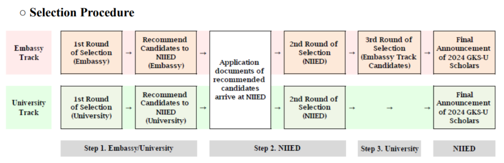 As an aspiring undergraduate student, you have two distinct paths to embark on this enriching journey of fully funded education in Korea: the Embassy Track and the University Track. The Embassy Track offers you the opportunity to apply through your country’s Korean embassy, while the University Track allows direct applications to participating Korean universities. This flexibility ensures that students worldwide can explore GKS Scholarships 2024 and their boundless potential.