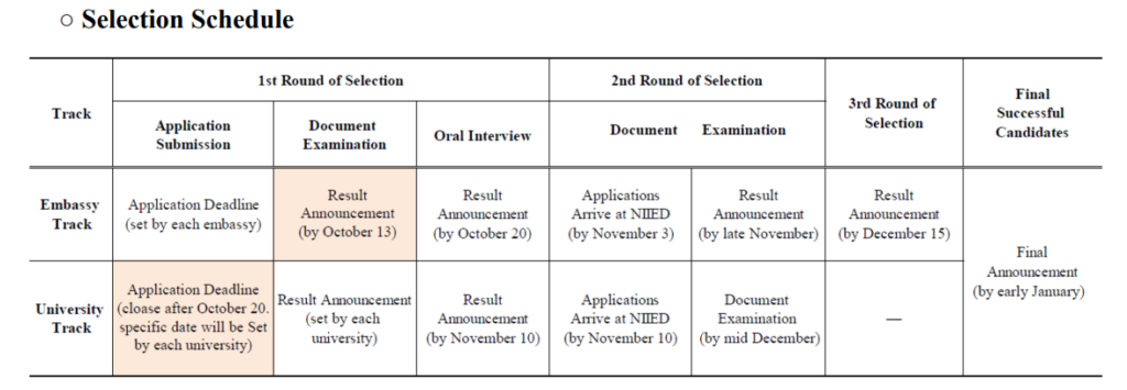 Contact the 1st Selection Organization (Embassy or University): Reach out to the respective 1st selection organization, whether it’s the embassy or university. They will provide you with comprehensive information regarding the application submission process. This includes details about submission deadlines, required documentation, interview procedures, and more. Keep in mind that the application deadlines may vary depending on the specific embassy or university handling the 1st selection round. Typically, these deadlines fall around late September to early October.