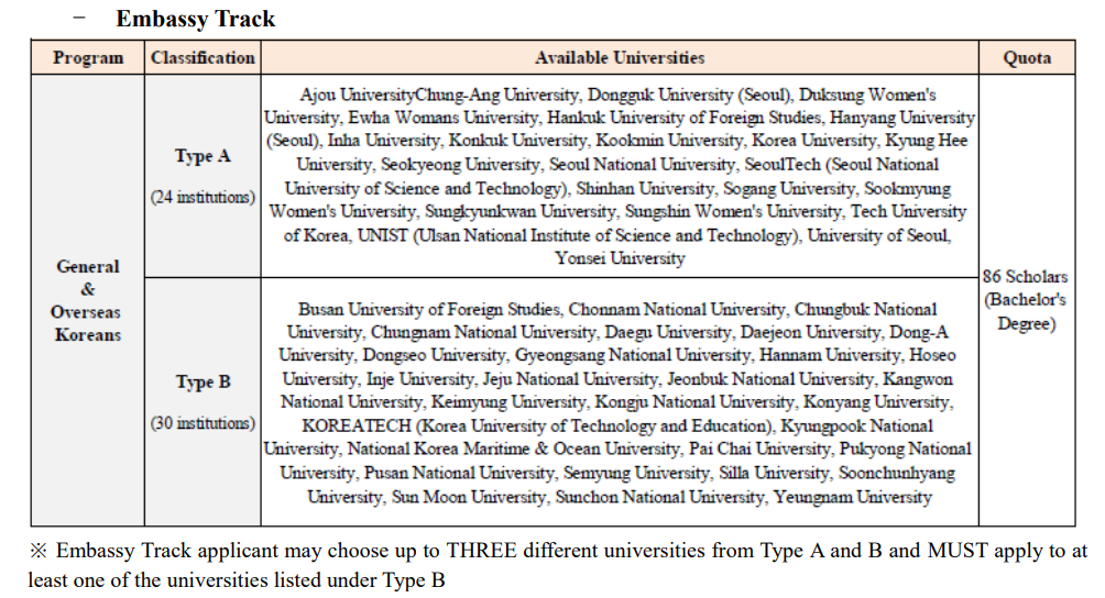 Are you an international student aspiring to study in Korea under the Korean Government Scholarships, specifically the Global Korea Scholarships 2024 program for undergraduate degrees? To help you get started on your academic journey, here’s a comprehensive list of the universities available for both the Embassy track and University track: