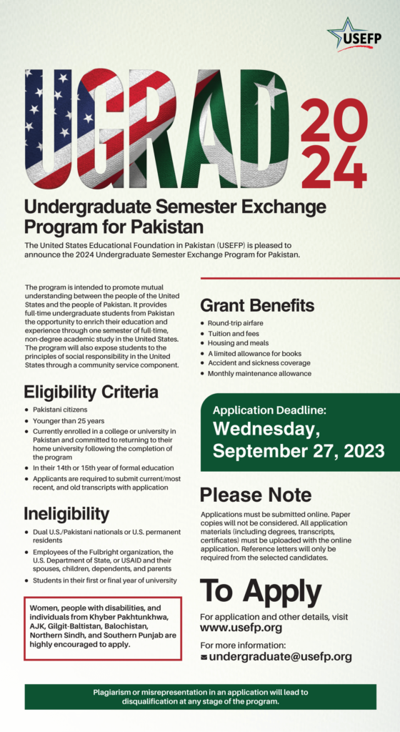 The Global Undergraduate Semester Exchange Program (UGRAD) for Pakistan is a prestigious scholarship opportunity that enables Pakistani students to study in the United States for one semester. This fully funded program, sponsored by the U.S. Department of State, offers a unique chance for undergraduate students from Pakistan to experience American education, culture, and society. In this post, we’ll explore the eligibility criteria, benefits, application process, and tips to make your application stand out.